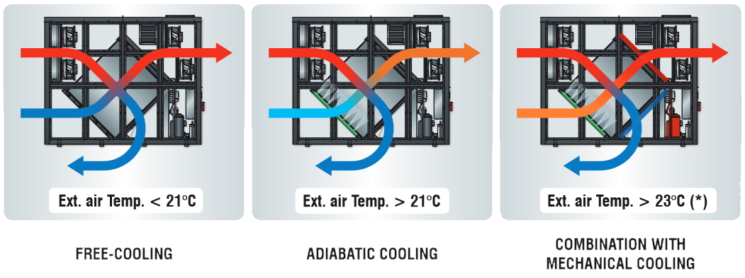 The indirect Free Cooling of DataBatic units can be extended to a greater number of hours per year and to more climatic zones thanks to the combination of the Evaporative Cooling system and of the air-to-air cross-flow heat exchanger. The decrease (and in some cases the cancellation) of the mechanical operation thus leads to a twofold benefit: the reduction of running costs (lower PUE levels) and the reduction of implementation costs thanks to lower installed electrical powers.The HDB units can be equipped with the “refrigerating circuit option” and are fully factory assembled in a one-piece solution to facilitate the installation.