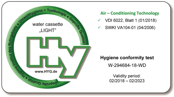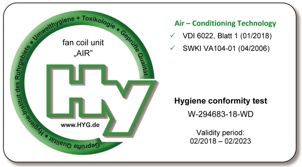 Hygienic fan coil unit compliant to VDI 6022: a simple and immediate solution for safety of people in confined environments. A comfortable and healthy indoor climate for people are important aspects in the field of air conditioning and ventilation technology. In offices, hotels, clinics or in the private sector, a high and trouble-free performance, maximum silence as well as a modern design of the fan coil units is guaranteed by COOLtec. In addition, the fan coils AIR-HY and cassettes LIGHT-HY have been tested and approved according to VDI 6022 sheet 1 (edition 01/2018) by the Hygiene Institute of the Ruhr area. The units thus meet all the high requirements of VDI 6022 Sheet 1 (01/2018) for perfect indoor air quality and unhesitating use in buildings with high hygienic standards.